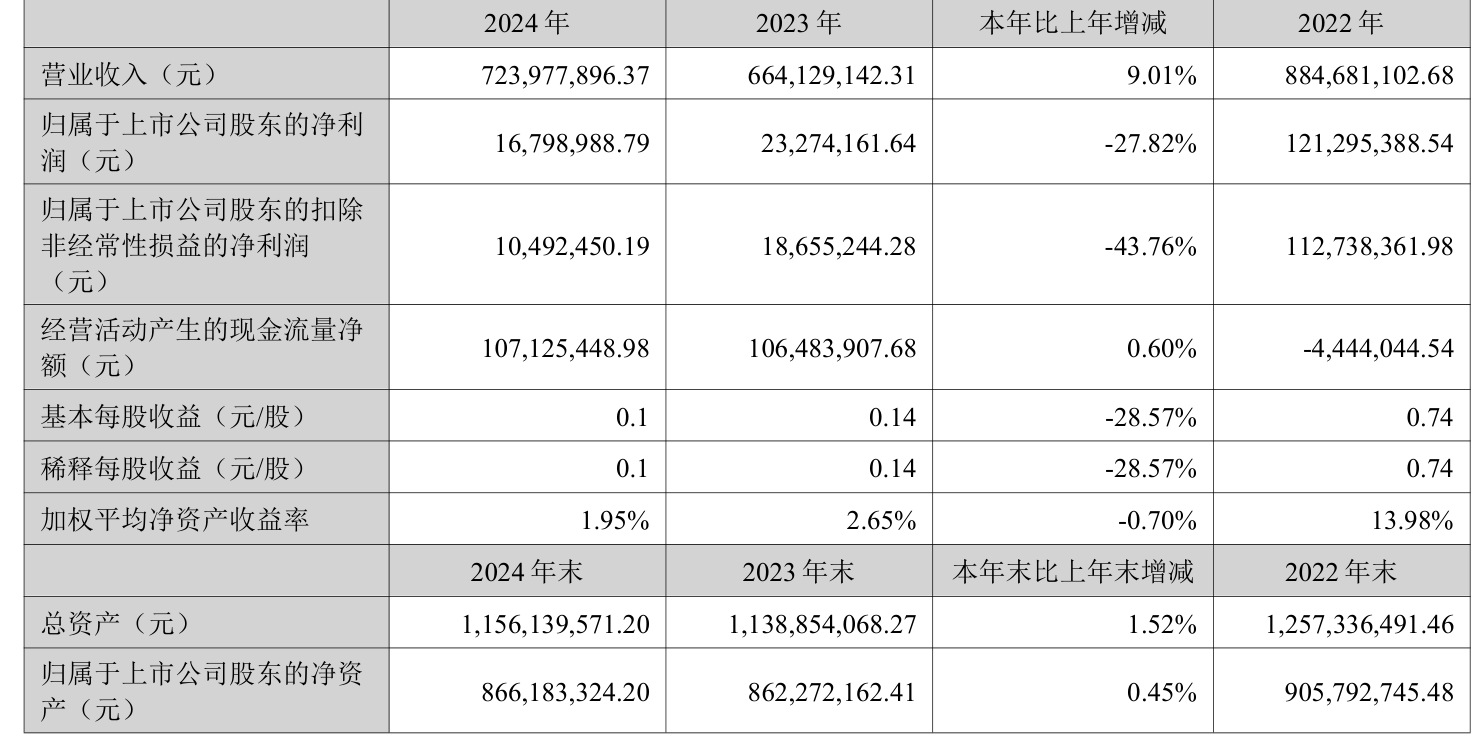 中证智能财讯亚世光电(002952)4月25日披露2024年年度报告。2024年,公司实现营业总收入7.24亿元,同比增长9.01%;归母净利润1679.9万元,同比下降27.82%;扣非净利润1049.25万元,同比下降43.76%;经营活动产生的现金流量净额为1.07亿元,同比增长0.60%;报告期内,亚世光电基本每股收益为0.1元,加权平均净资产收益率为1.95%。公司2024年度分配预案为:拟向全体股东每10股派现0.5元(含税)。