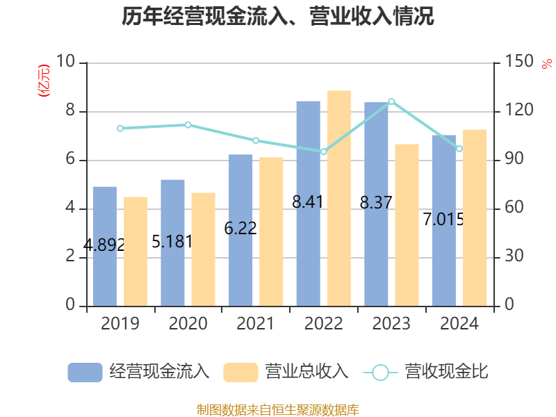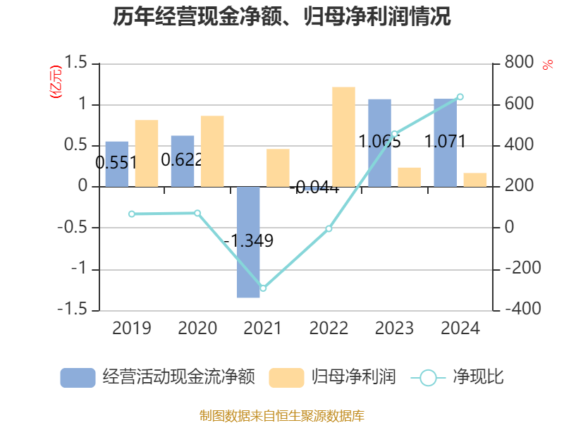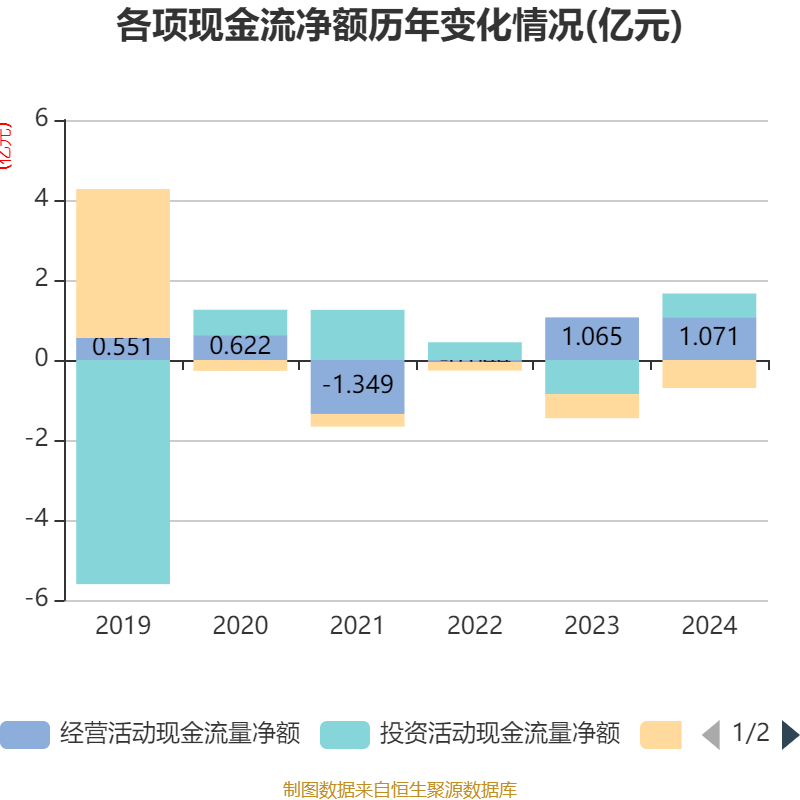 截至2024年,公司经营活动现金流净额为1.07亿元,同比增长0.6%;筹资活动现金流净额-6987.71万元,同比减少945.3万元;投资活动现金流净额5911.19万元,上年同期为-8512.5万元。