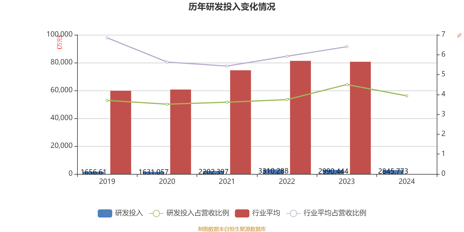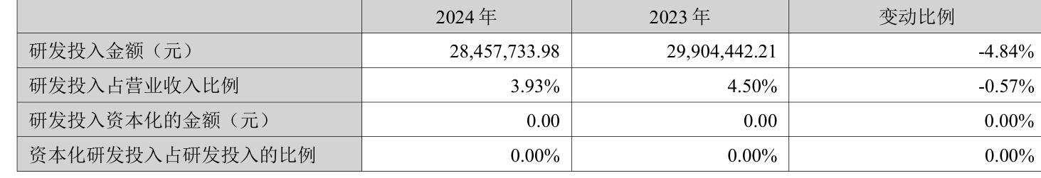 2024年全年,公司研发投入金额为2845.77万元,同比下降4.84%;研发投入占营业收入比例为3.93%,相比上年同期下降0.57个百分点。此外,公司全年研发投入资本化率为0%。