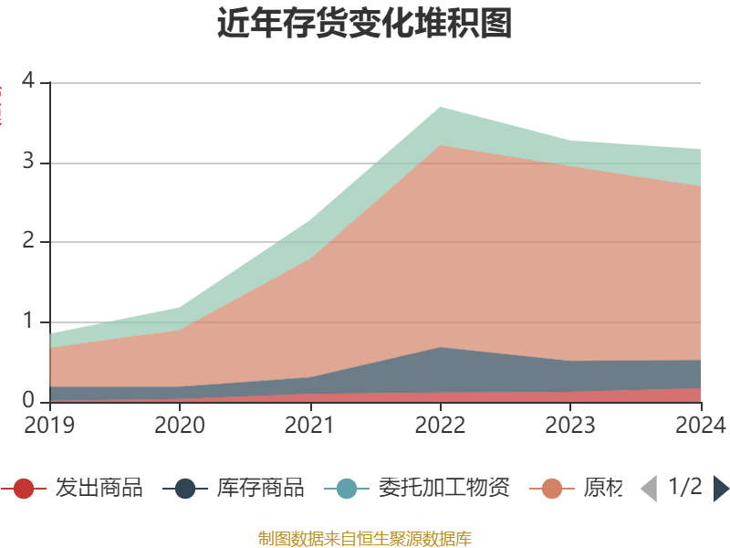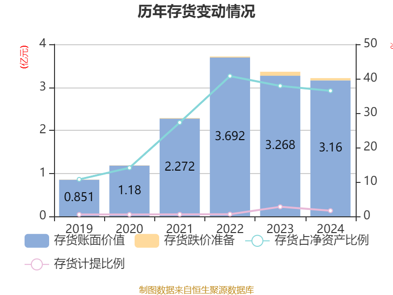 从存货变动来看,截至2024年末,公司存货账面价值为3.16亿元,占净资产的36.48%,较上年末减少1083.01万元。其中,存货跌价准备为525.54万元,计提比例为1.64%。