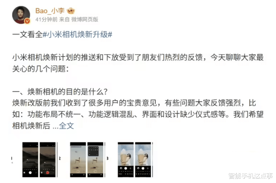 比如小米手机相机部产品经理Bao_小李介绍了小米相机焕新升级计划,焕新前收到用户反馈,存在功能布局不统一、逻辑混乱等问题。