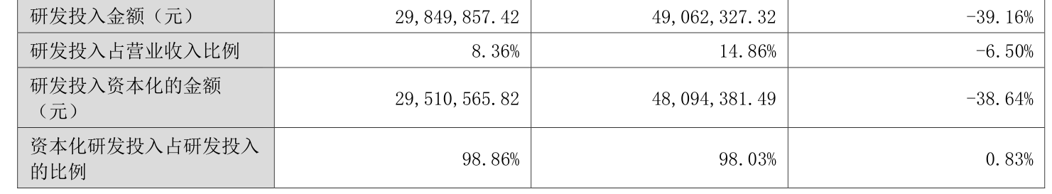 2024年全年,公司研发投入金额为2984.99万元,同比下降39.16%;研发投入占营业收入比例为8.36%,相比上年同期下降6.5个百分点。此外,公司全年研发投入资本化率为98.86%。