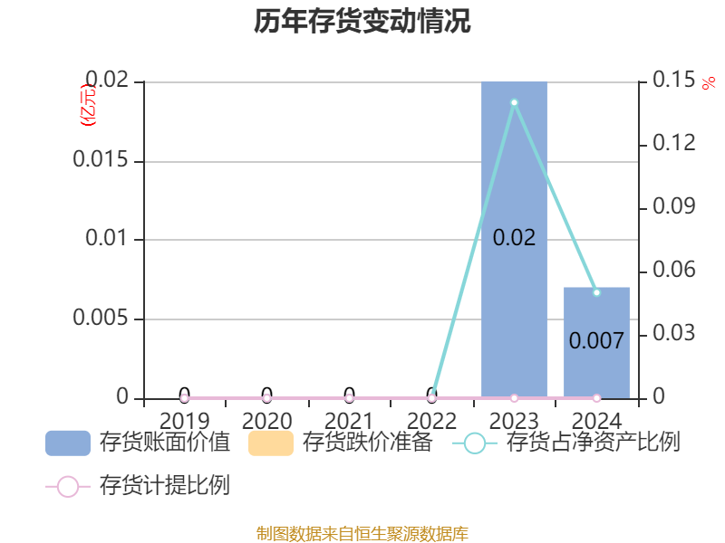 从存货变动来看,截至2024年末,公司存货账面价值为73.89万元,占净资产的0.05%,较上年末减少129.96万元。公司本期没有计提存货跌价准备。