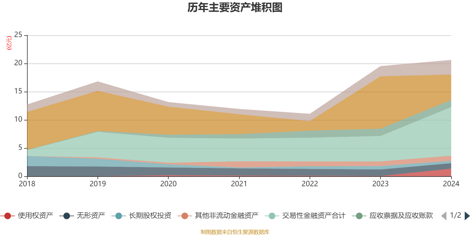 资产重大变化方面,截至2024年末,公司货币资金较上年末减少51.31%,占公司总资产比重下降25.64个百分点;交易性金融资产合计较上年末增加90.86%,占公司总资产比重上升18.64个百分点;使用权资产较上年末增加3487.58%,占公司总资产比重上升6.27个百分点;其他应收款(含利息和股利)较上年末增加279.89%,占公司总资产比重上升1.55个百分点。